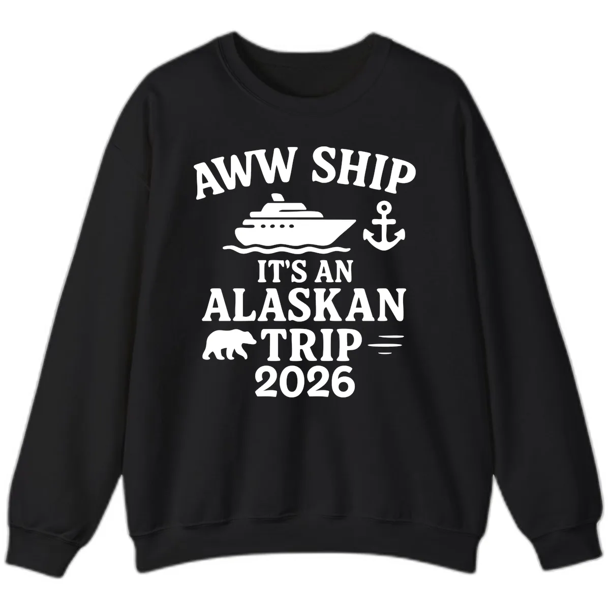 Our sweatshirts are printed using durable methods designed to last. The 'AWW SHIP IT'S AN ALASKAN TRIP 2026' graphic, including the cruise ship and bear, should remain vibrant wash after wash.