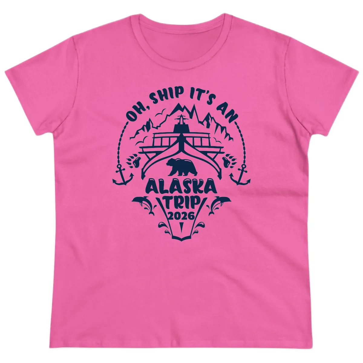 Sail into fun with the "Oh Ship It's An Alaska Trip 2026" Ladies Tee! This charming design features a nautical badge with a cute cruise ship, a friendly bear, snowy mountains, and playful whale tail splashes – perfect for your unforgettable 2026 Alaska cruise. It's the ideal blend of a hilarious pun and stunning Alaskan scenery, designed to make you smile every time you wear it.