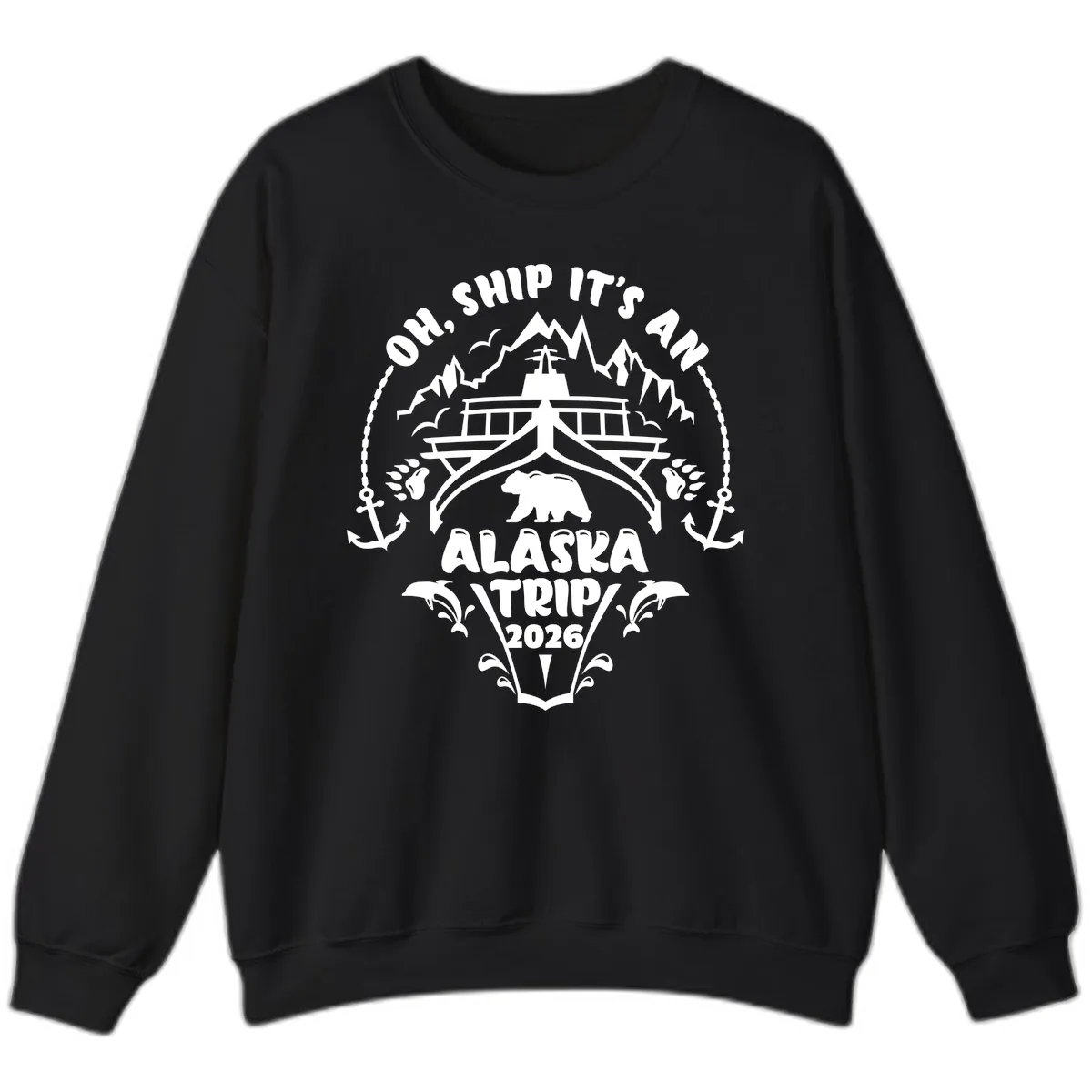 The nautical badge design, featuring the cruise ship, bear, and mountains, is printed clearly on the sweatshirt. The text 'OH, SHIP IT'S AN ALASKA TRIP 2026' is bold and easy to read, making it a fun statement piece.