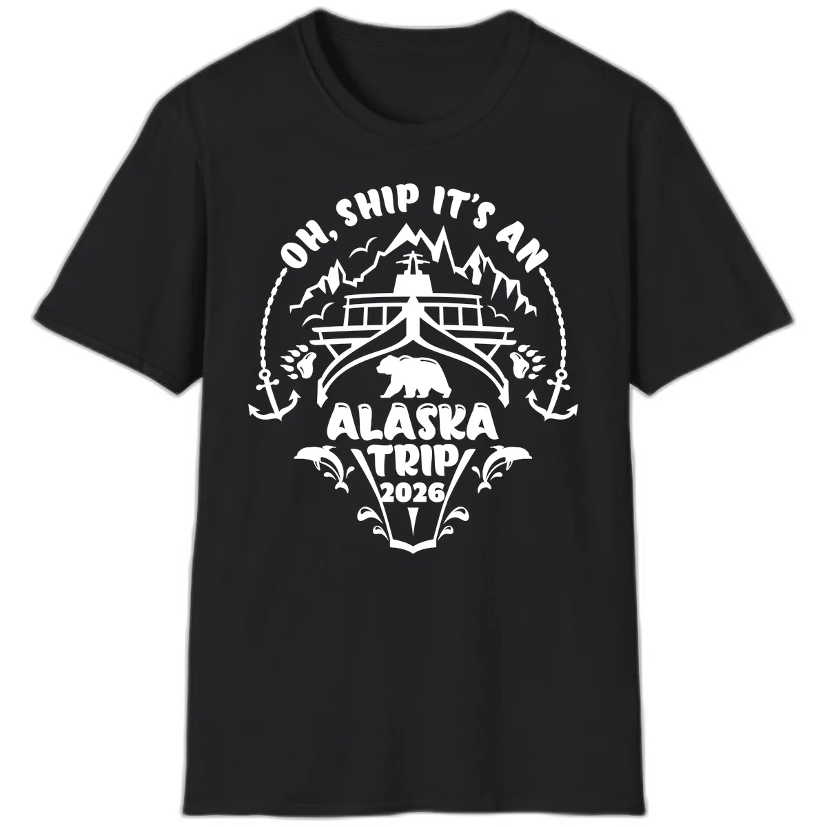 The graphic includes a cruise ship, a bear, mountains, anchors, and whale tail splashes. The text 'OH, SHIP IT'S AN ALASKA TRIP 2026' arcs around the design.